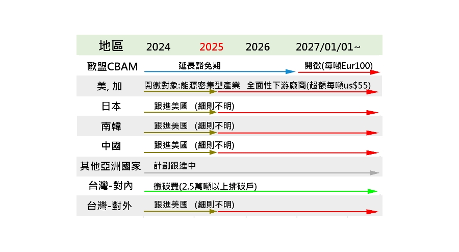 2023/06/03 歐盟宣布全面性的CBAM延後到2027, 主要的6項重大碳排(如水泥, 鋼, 鋁, 電力…等) 今年10月1日開始徵收碳稅. 然而進口大國, 如美、加、中等, 依然維持2025/01/01 全面開徵碳稅的計畫, 時程表如下: